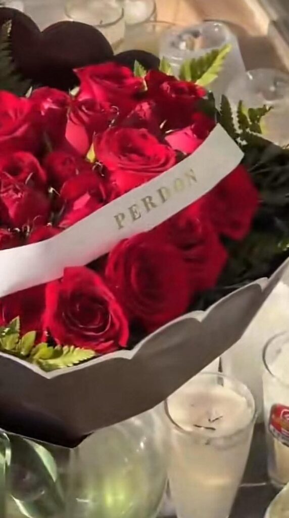 Peritos del Instituto Jalisciense de Ciencias Forenses y agentes de la Fiscalía del Estado aseguraron un ramo de rosas rojas con la palabra ‘perdón’ escrita con letras doradas en un listón blanco, que fue dejado en la puerta de la estética de la fallecida influencer Valeria Márquez, en el municipio de Zapopan.