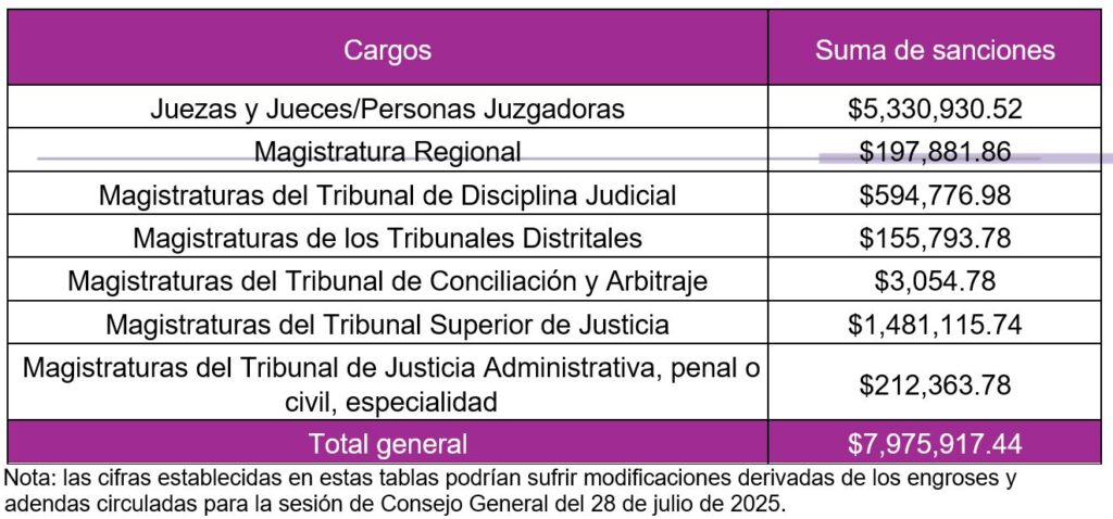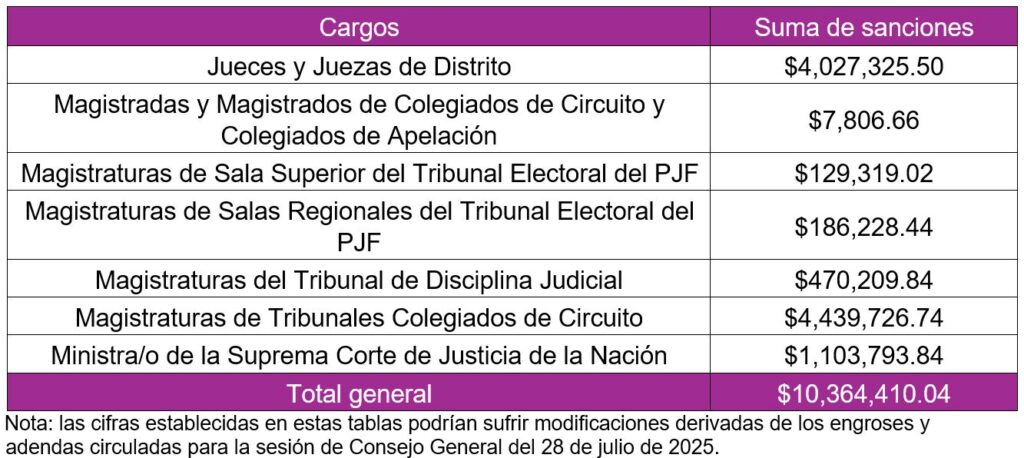 Sobre las candidaturas federales, informó que el 83 % de las sanciones se concentran en magistraturas de tribunales colegiados de Circuito, así como en juezas y jueces de Distrito y, en lo local, Chihuahua y el Estado de México destacan por la concentración del 35.9 % del total sancionado.
