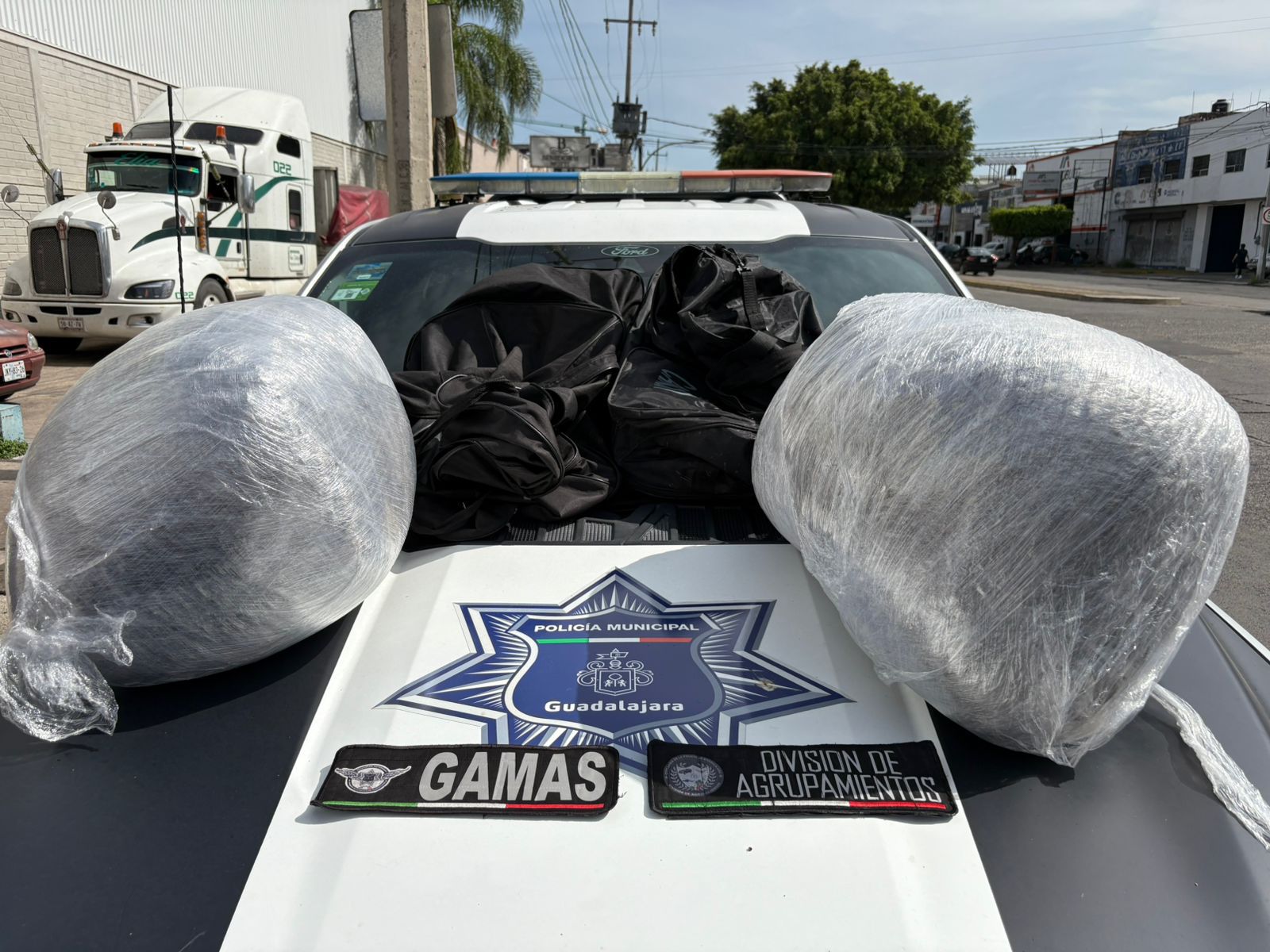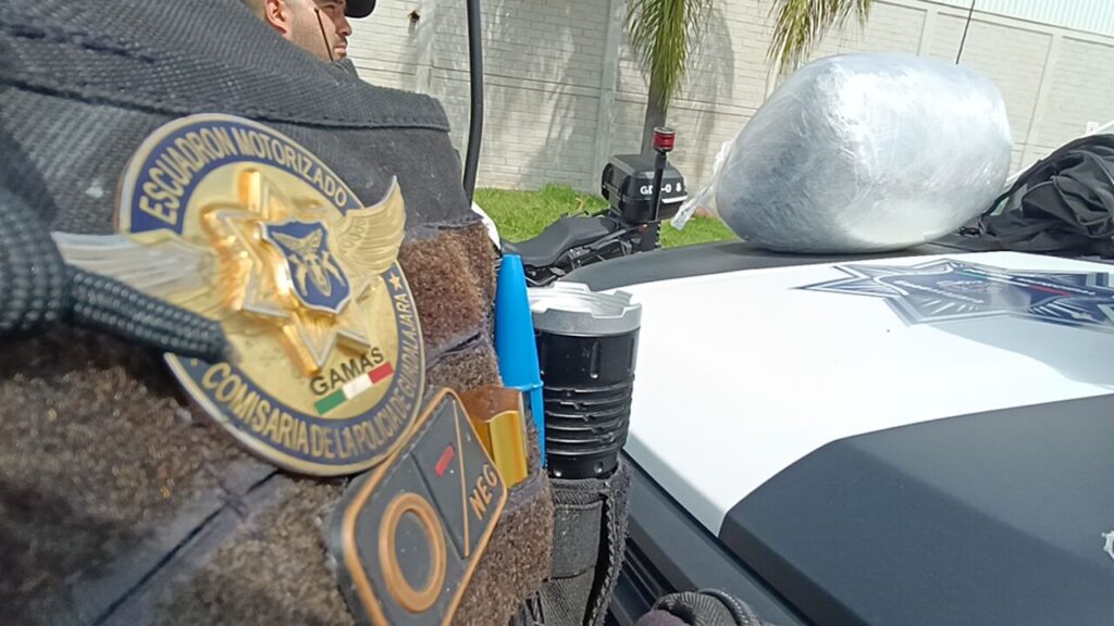 Uniformados patrullaban en Calzada del Ejército, entre Río Rhin y Calzada Jesús González Gallo, cuando el conductor de un taxi les pidió apoyo y les mencionó que su pasajero llevaba dos maletas que desprendían el olor aparentemente a marihuana.