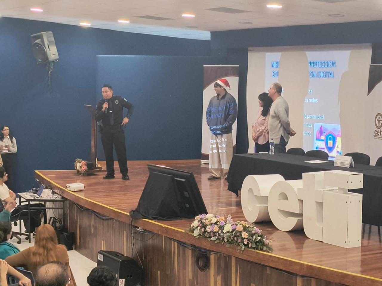 Oficiales adscritos a la Policía Escolar de la Comisaría de Seguridad Ciudadana de Guadalajara capacitaron y orientaron a las y los alumnos -y sus familiares- y docentes del CETI-Colomos, en Prevención de Delitos Cibernéticos.