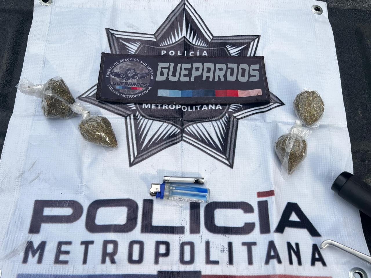 Ante esto, uniformados le marcaron el alto y, tras realizarle una inspección conforme a protocolo, le aseguraron cuatro envoltorios transparentes de aparente marihuana con un peso aproximado a los 65.5 gramos, además de una pipa metálica y un encendedor.