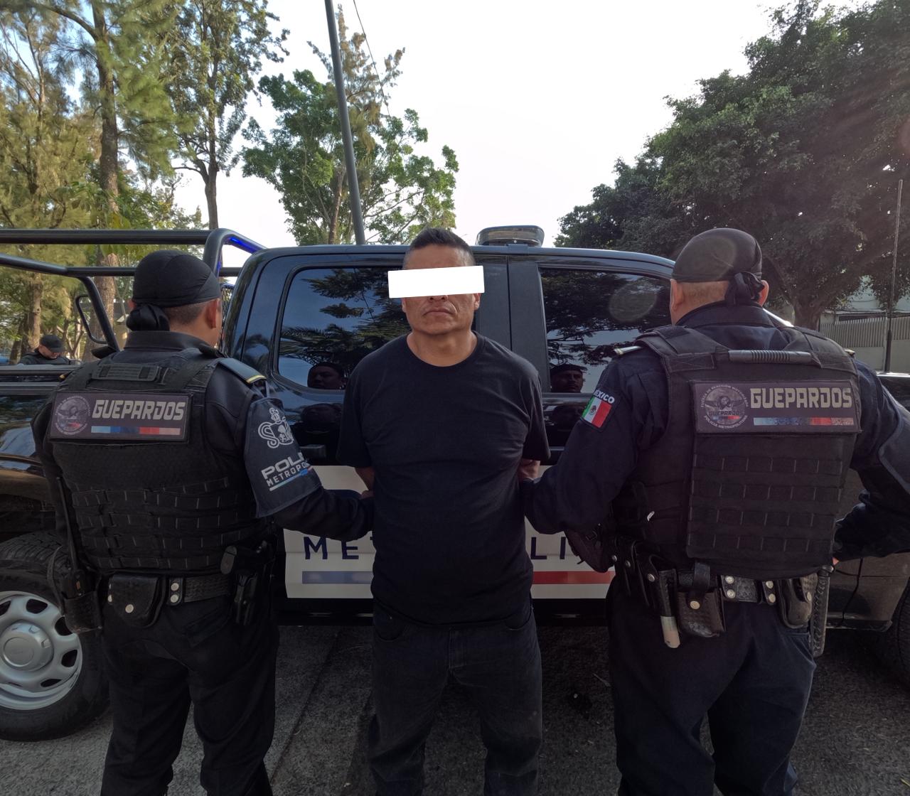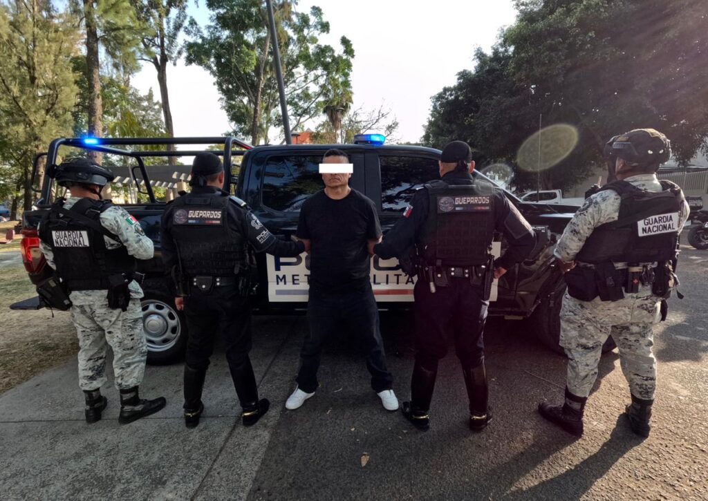 La detención se registró en el cruce de Gigantes y Perfecto G. Bustamante, al exterior de la estación Tetlán de la Línea 2, donde elementos del Escuadrón Motorizado “Guepardos” detectaron a un sujeto que portaba a la altura de la cadera lo que aparentaba ser un arma de fuego.